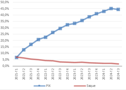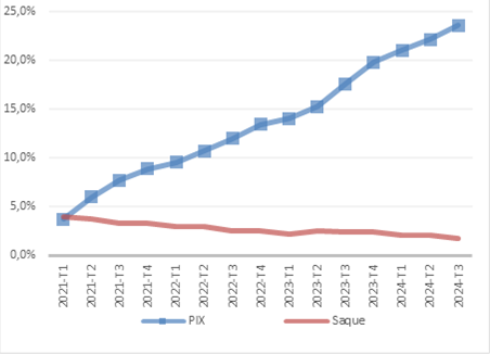entretanto, o expressivo aumento do Pix pode ter implicado redução relevante dos saques.